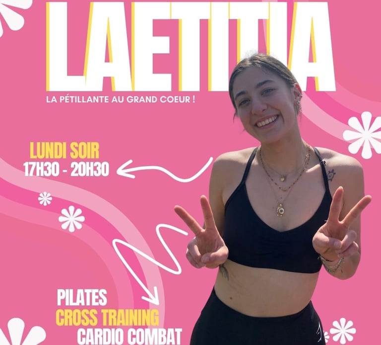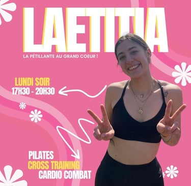 💥 Retrouve-la chaque jour sur les coachings individuels et divers cours cardio & renfo. Au programme : une énergie de feu et une créativité sans fin !